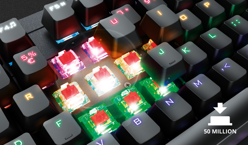 The mechanical Outemu RED switches are designed to be extremely quick and responsive. With a minimum actuation force of 30G (50G max) and the actuation point of only 2mm (4mm total travel), this keyboard registers your input before you even realize you’re pressing a button. They have a linear feel and will last up to 50 million key presses!