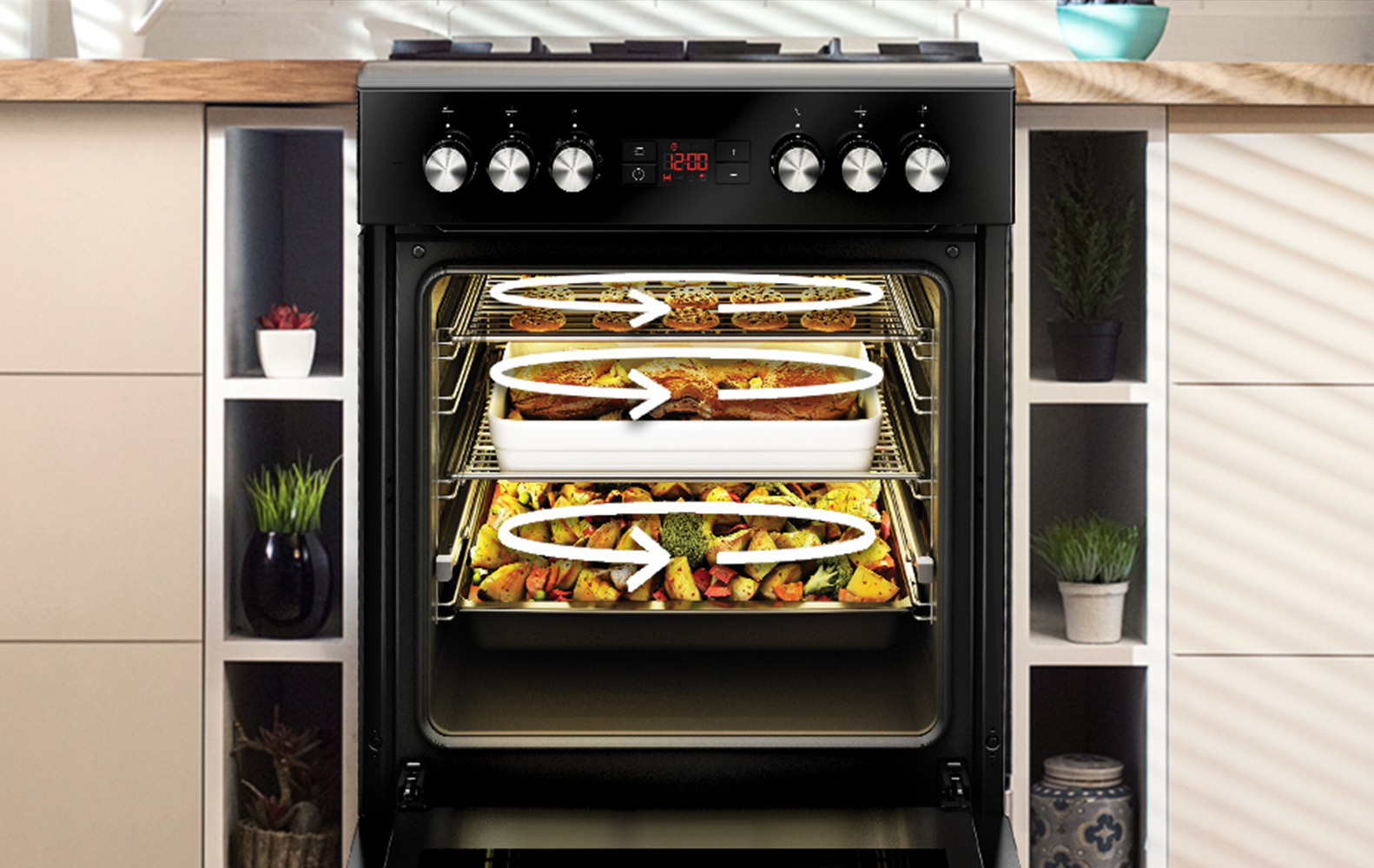 3D baking is a new generation of baking that activates all heating elements present in a given model and works multidimensionally. The oven heaters operate sequentially to distribute heat evenly throughout the interior. 3D baking also allows you to bake several dishes at the same time.
