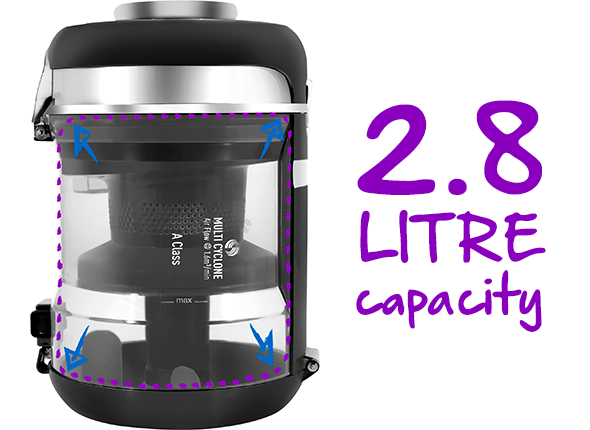 You’ll be able to vacuum for longer without needing to empty the dust bin often thanks to its large 2.8L capacity. And, the dust bin comes with an indicator light that lets you know when it needs to be emptied, helping you to keep your vacuum well-maintained.