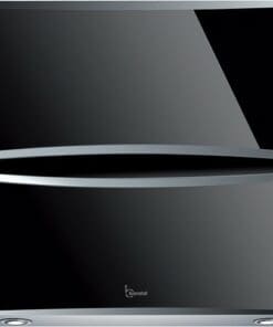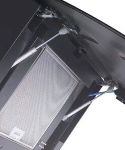 The Bells Wave wall-mounted hood features a sophisticated top made of sleek black glass, seamlessly blending aesthetics with practicality. The inventive elliptical extraction system effectively captures and removes fumes and vapors. The panel can be raised to simplify cleaning and upkeep.