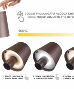 Rechargeable table lamp with touch-controlled activation. With a simple touch, you can choose between warm, cool, or natural light. The light intensity is adjustable by holding down the power button. Water-resistant, it can be used in both indoor and outdoor settings. The 33mm bottle adaptor provides an elegant alternative to the tabletop version, allowing you to place our lamp on your favorite bottle at the center of your table.