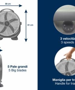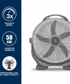 This floor fan is perfect in any room of the house, but also on the terrace or veranda and wherever you need to bring in a powerful breath of fresh air. The modern design gives this fan excellent stability, while the 5-degree blades and vertical directionality of the airflow allow for high and uniform air circulation. 3 selectable speeds for maximum user comfort.