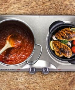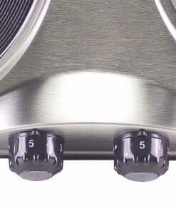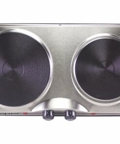 Electric hot plate with a steel body and two 15.5- and 18.5-cm-diameter cast iron plates. Two thermostats may be used to control the five temperature settings on the two distinct plates. danger light is on. Non-slip feet and overheating protection enhance stability.
