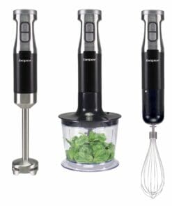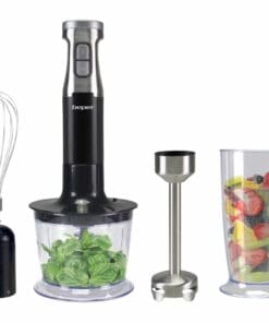 Included in the 4-in-1 blender set are a stainless steel whisk, a 500 ml chopper with stainless steel blades, a 700 ml graded beaker, and an immersion blender. ABS and stainless steel housing, with an ergonomic handle for a secure grip