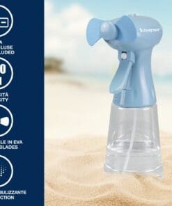 Mini mist fan ideal to bring freshness to your hot summer days. Compact design and battery operation make it the perfect travel companion, that can follow you to the pool, the beach or during your walk. With soft EVA blades for complete safety and 350 ml water tank for mist function.