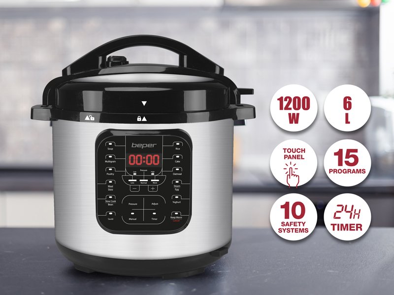 The multicooker pressure cooker is the perfect tool for rapidly and conveniently making delectable meals. Its 15 pre-set programs provide a variety of options for appetizers, entrées, sides, and desserts. Sophisticated control panel with an intuitive LED display that is simple to operate. A 24-hour timer can be used to delay starting the cooking process as well as to specify the cooking time. Several safety control systems, including lid open/close protection, pressure and temperature control, anti-jamming, leakage and overheating control, are included.