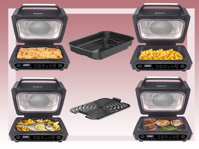 The Cucinotto multifunction hot air fryer and grill helps you take your cooking to the next level. It fries without oil thanks to high-speed hot air circulation and grills food creating the marks and flavours of a perfect, authentic barbecue. 8 preset programmes: Air scrisp for air frying; Roast for roasting; Grill for grilling with 4 cooking modes: low, medium, high, maximum; Dehydrate for drying, Bake for baking, Pizza for pizzas or focaccias; and Broil for cooking frozen food and Manual.