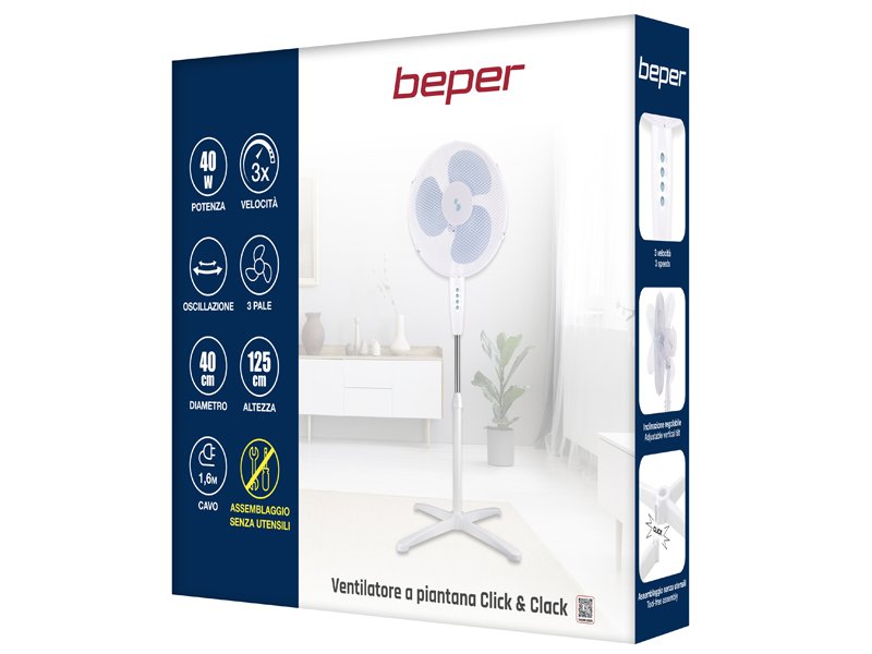 Brand: BeperPower: 40 WFunctions: OscillationMaterial: Metal/ABSDimensions: 55x55x125 cmProduct Type: Stand FanWarranty: Parts 2 years & Labour 2 years