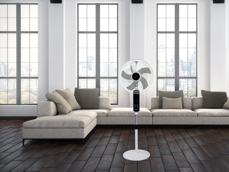A floor standing fan with a touch screen and five ABS blades that are shielded by a metal grill that measures 45 cm. The three speeds, the standard, breeze, or night operation modes, the oscillating function, and the programming of timers up to 7.5 hours are all selectable via the touch panel. with a spherical base for maximum stability and an adjustable height of up to 130 cm. includes a useful remote control.