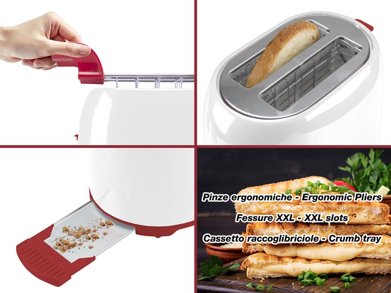 2-slice toaster with ABS body and stainless steel pliers with ergonomic handles for preparing stuffed toasts. Large slots slice up to 3.5cm thick. 7 toasting levels with auto-off at the end of cooking. Stop button to finish toasting at any time. Crumb tray and cord winder.