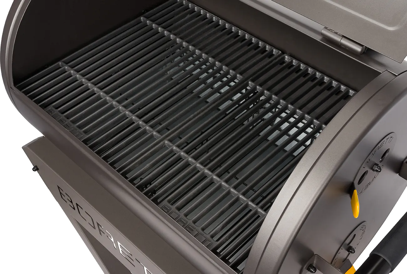 Brand: BorettiNumber Of Coal Trays: 2Thermometer: Integrated thermometerVentilation grill: YesMaterial: Cast Iron GrillCooking surface: (WxD) 58x41cmDimensions: Depth 52 cm, Width 81cm, Height 104 cmProduct Type: Charcoal BarbecueWarranty: Parts 2 years & Labour 2 years