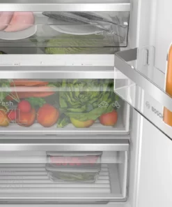 The Bosch Built-in Fridge seamlessly integrates into your kitchen, offering high performance and energy efficiency. It features FreshSense technology, which constantly monitors and controls the temperature for optimal food preservation, ensuring consistent cooling no matter the external conditions. With multiple adjustable glass shelves, spacious compartments, and specialized sections for fruits and vegetables, this built-in fridge is designed for organized and convenient storage. LED lighting provides clear visibility inside. The fridge also operates quietly, making it an ideal choice for modern kitchens.