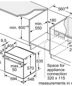 Brand: BoschPower: 3.6 KwOven capacity: 71LDisplay: TFT Clear TextFeatures: Fast preheating, Hot air 3D, Pyrolytic self-cleaningNumber of Cooking Functions: Defrost, Full width grill, Hotair gentle, Hot Air, Intensive heat, Half width grill, Conventional heat, Pizza setting, low temperature cooking, Bottom heat, Hot air grilling, pre-heating, WarmingEnergy Label: old-AEnergy Consumption: 0.97 kWh/AnnumEnergy Consumption With Fan: 0.81 kWh/CycleDimensions: (HxWxD) 595x594x548 mmWarranty: Parts 5 years & Labour 5 years