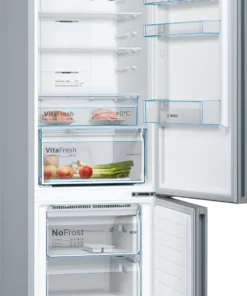 Brand: BoschFridge Capacity: 279 LitersNumber of Shelves in Fridge: 4 Saftey Glass ShelvesNumber of Drawers in Fridge: 2 drawersNumber of door compartments in fridge: 4 Compartments at door sideFreezer Capacity: 89 litersCooling system: No Frost SystemEnergy Label: EReversible door: Yes (By Request)Consumption: 238 kWh/AnnumNoise Level: 39 dB, Class DDimensions: Depth 60 cm, Height 203 cm, Width 60 cmInstallation Type: Free-StandingRefrigeration Type: Fridge-FreezersWarranty: Parts 5 years & Labour 5 years
