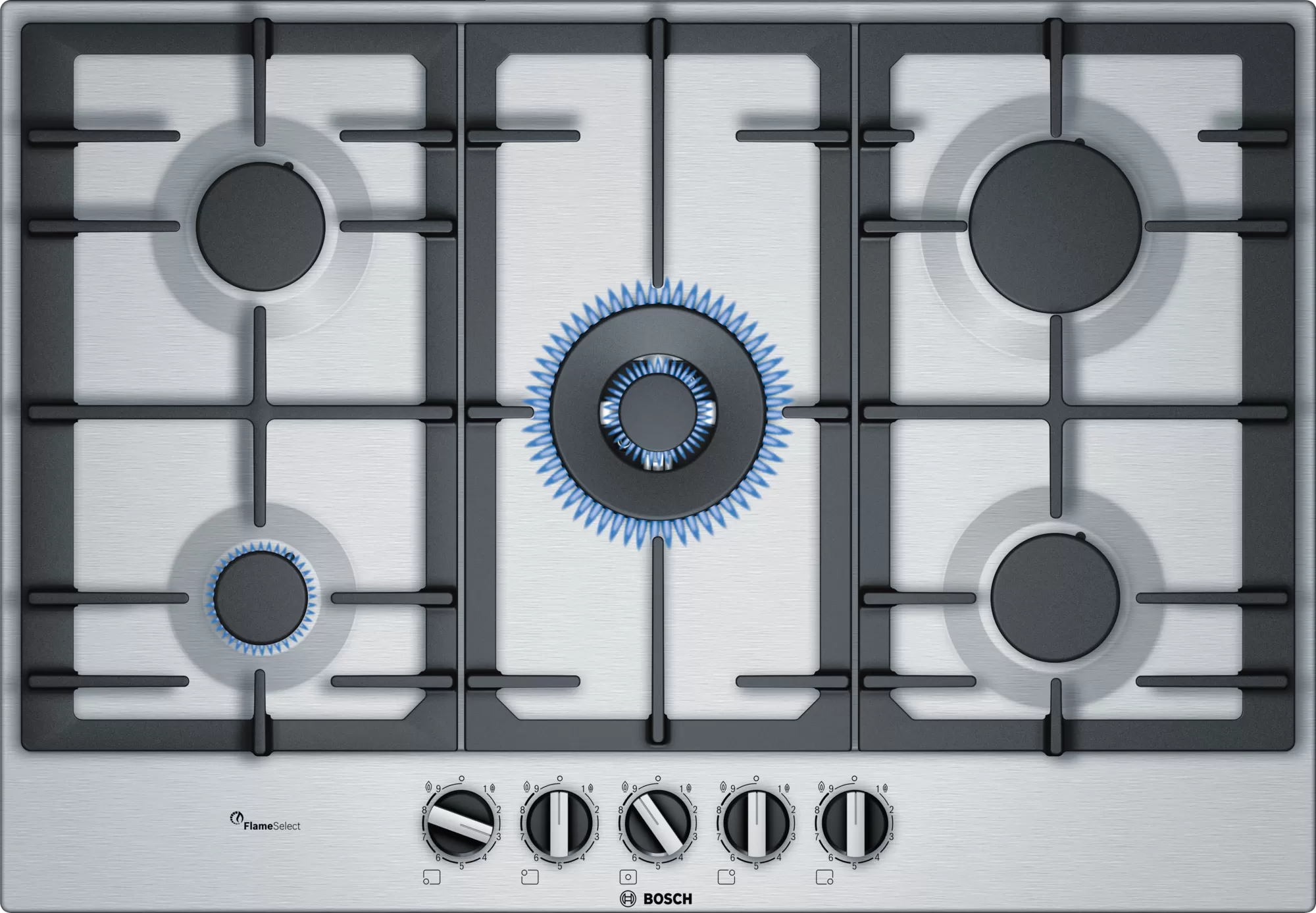 The Bosch PCQ7A5B90 gas hob offers stylish design, powerful performance, and versatility with five burners, including a high-speed burner and a wok burner. Its flameSelect feature provides precise flame control with nine heat levels for perfect cooking results.