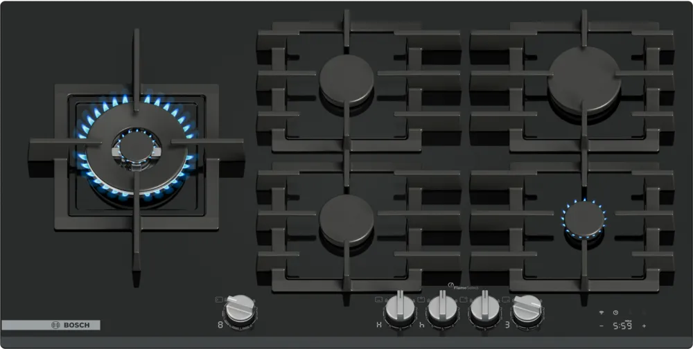 The Bosch Series 8 PRS9A6H40 gas hob combines sleek design with advanced functionality, making it an ideal choice for modern kitchens. Its black ceramic glass surface not only adds a touch of elegance but also ensures durability and ease of cleaning. Measuring 916 mm in width, 527 mm in depth, and 45 mm in height, this 90 cm hob is designed for seamless integration into your countertop.