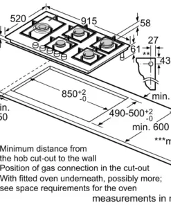 Brand: BoschPower: 7.5 kWNumber of cooking zones: 5 Gas BurnersIgnition: IntegratedMaterial: Ceramic GlassCook top type: GasDimensions: (WxDxH) 916 x 527 x 45 mmWarranty: Parts 5 years & Labour 5 years