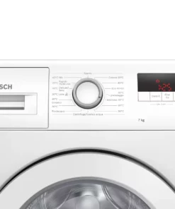 Brand: BoschLoad capacity: 7kgSpin Speed (RPM): 1000rpmNoise Level: Spinning Noise Level 72dBDisplay: LEDProgram List: Rinse, Water drain/spin, Mix, Quick 15 ‘/ 30’, Cotton, Synthetics, Delicates / Silk, Wool / Hand wash, add laundry functionFeatures: Active Water Plus, Speed Perfect, Wave basketFunctions: Aqua Vigil anti-flooding system, Drum cleaning functionWater Consumption: 45LColour: WhiteConsumption: Energy consumption 69 kwh per 100 cyclesDimensions: Depth 55cm, Height 85cm, Width 60cmWarranty: Cross, Drum, Bearings – 2 Years, Parts 5 years & Labour 5 years