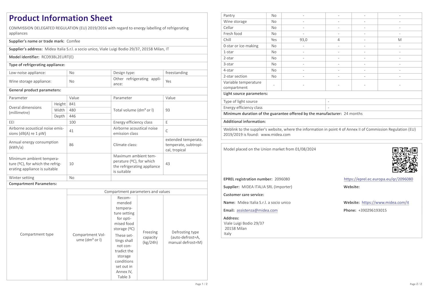 Brand: ComfeeFridge Capacity: 93LNumber of Shelves in Fridge: 2 ShelvesNumber of door compartments in fridge: 3Freezer Compartment: YesEnergy Label: EEnergy Consumption: 86 kWh/AnnumNoise Level: 41dBDimensions: (WxHxD) 480 x 841 x 446 mmRefrigeration Type: FridgesWarranty: Parts 2 years & Labour 2 years