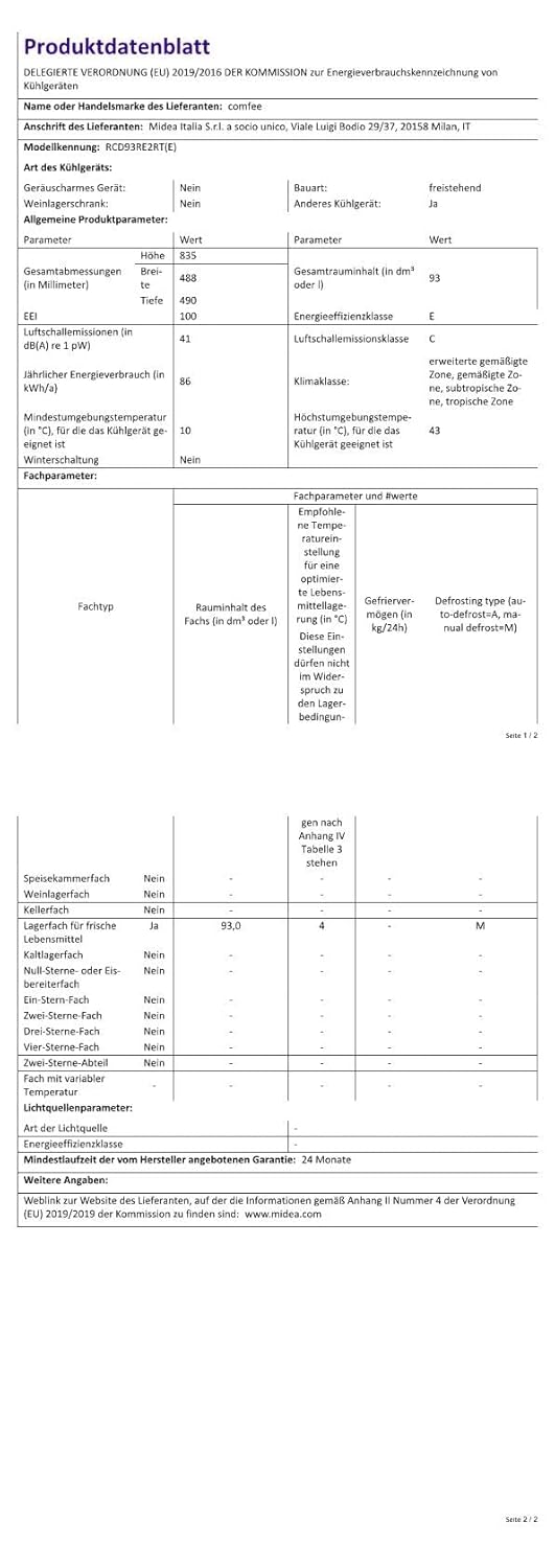 Brand: ComfeeFridge Capacity: 93LNumber of Shelves in Fridge: 2Number of door compartments in fridge: 3Energy Label: ENoise Level: 41dBDimensions: (WxHxD) 488 x 835 x 440 mmInstallation Type: Free-StandingRefrigeration Type: FridgesWarranty: Parts 2 years & Labour 2 years