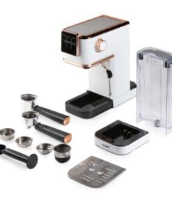 From strong espressos to creamy cappuccinos and iced coffees, this piston machine offers endless possibilities. The Italian ULKA pump with 20 bar pressure ensures an intense aroma and perfect crema. The thermoblock heating system and PID temperature control guarantee fast heating and precision. Prepare any coffee variety you want thanks to the iced coffee function, steam nozzle, and accessories for ground coffee, ESE coffee pods or capsules. The intuitive touchscreen colour display and design with luxurious white and rose gold accents make this coffee machine a stylish and functional addition to your kitchen.