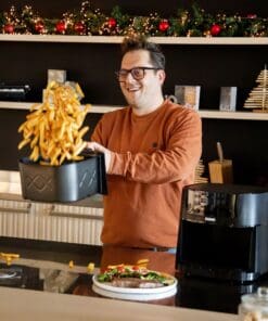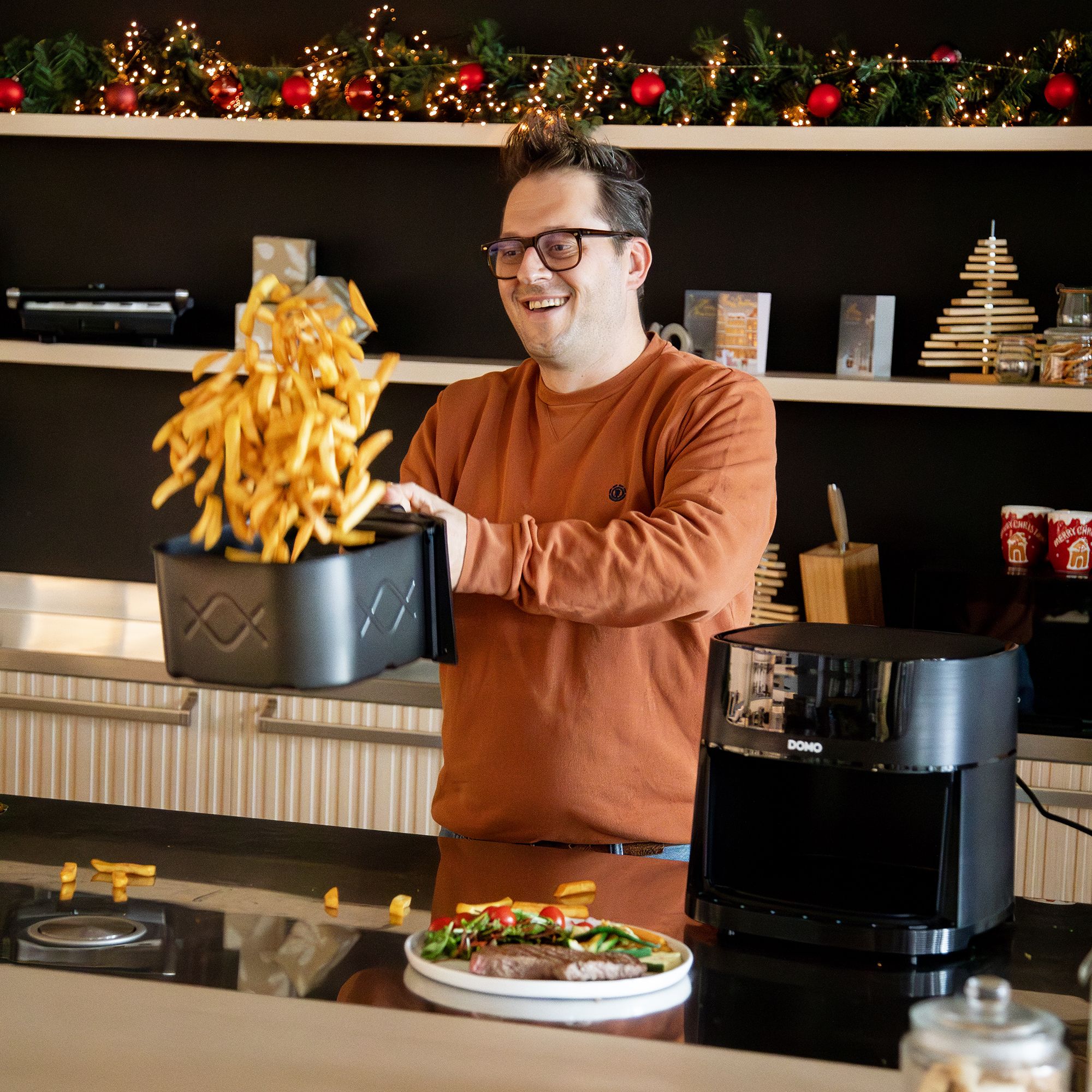 Discover the DOMO air fryer XXL DO543FR with a very large baking capacity of 8 litres and a power of 1800 W! With this air fryer, you can make snacks, fries, quiche or even cake for the whole family in no time. The deep fryer, with deep fryer rack, is suitable for frying up to 2 kg of fries! Thanks to the viewing window, you can also follow the baking process and the device has a reminder function to shake up the food. The airfryer has a digital display with touch control with 8 pre-programmed programs, but you can also easily set the temperature between 80° and 220°C yourself. The basket and the grid are provided with a PFAS-free non-stick coating. Get this culinary must-have today!