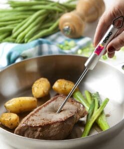 Effortlessly determine the perfect cooking time for your steak with the DOMO culinary thermometer. The illuminated display reveals the temperature within 5 seconds. This versatile tool extends beyond just meat, allowing you to accurately measure the temperature of sauces, poultry, cakes, chocolate, sugar caramel, and more. Crafted from stainless steel, the thermometer operates on two batteries and features an automatic shutdown after use. The temperature range, available in Celsius or Fahrenheit, spans from -45°C to +200°C.
