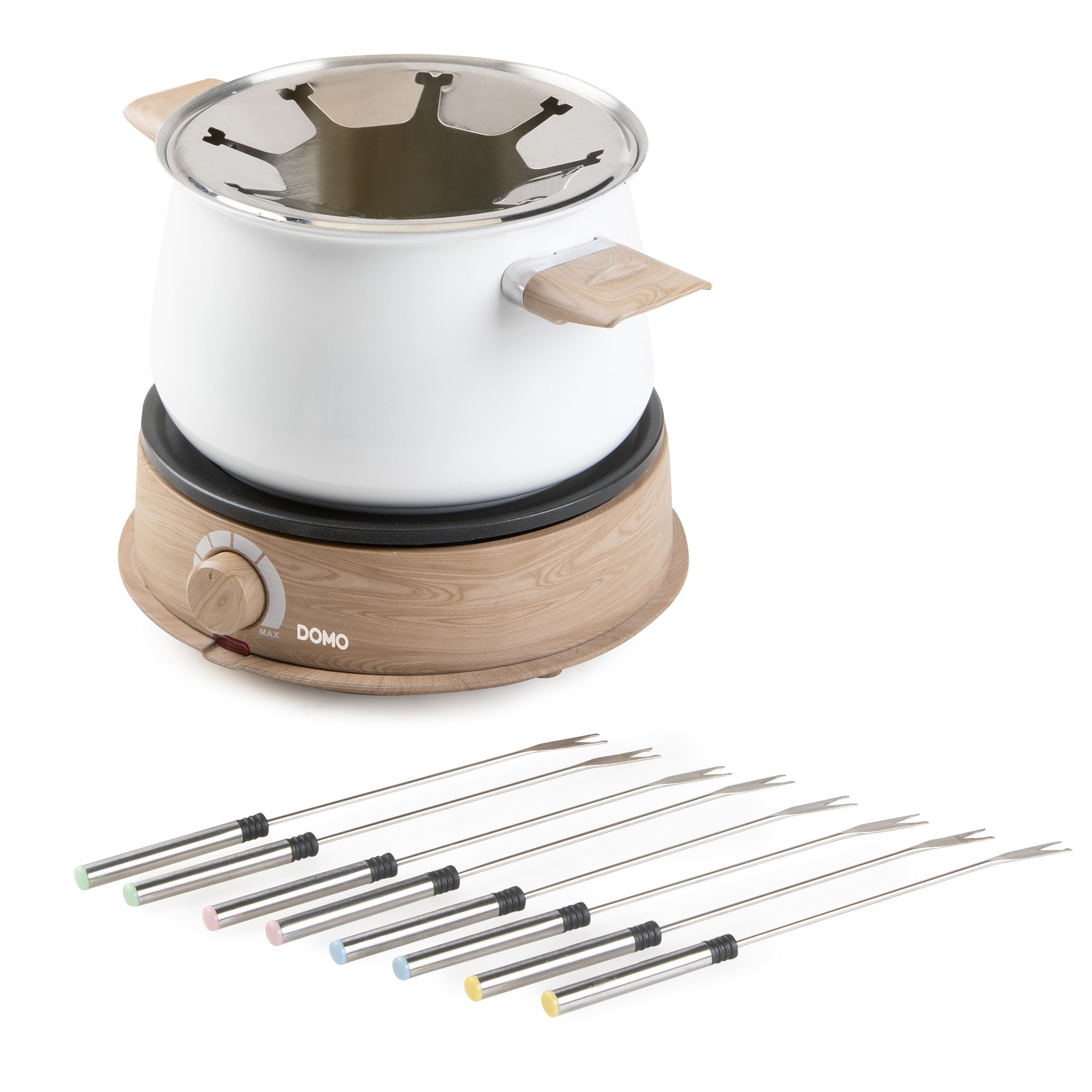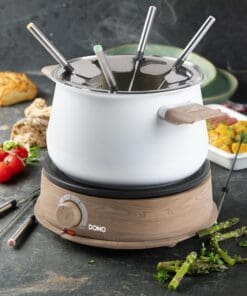 Brand: DOMOTank Capacity: 1.4LPower: 1500WFeatures: Adjustable Thermostat with Indicator light, Dishwasher-proof, Removable TubIncluded In the Box: 8 fondue skewersWarranty: Parts 2 years & Labour 2 years