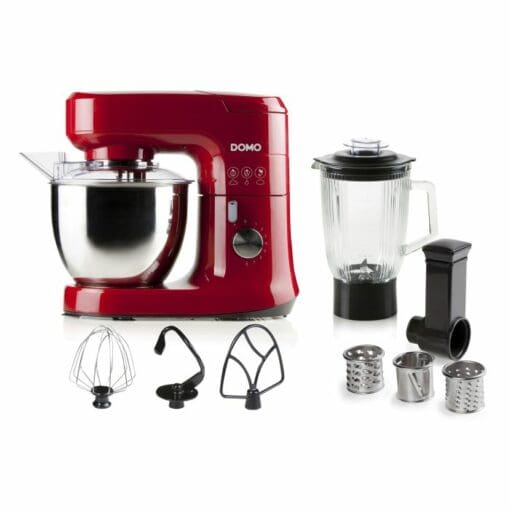 The DOMO appliance is not just an ordinary food processor; it offers versatility with its various accessories such as the beater, dough hook, stainless steel balloon whisk, vegetable slicer, and blender. Its stainless steel mixing bowl can hold up to 4.5 liters. The transparent anti-splash lid has a convenient opening for adding ingredients while mixing or beating. You can easily adjust the speed using the practical knob. With its planetary movement, this food processor ensures consistent and excellent mixing performance.
