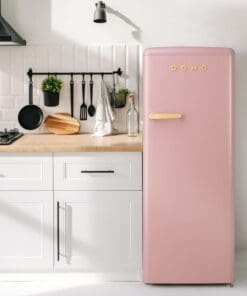 Add a touch of retro charm to your kitchen with the DOMO DO91708R fridge-freezer. This stylish pink fridge with wood-look handle combines trendy design with high-quality performance, perfect for those who value both functionality and aesthetics. Moreover, it has a generous capacity of 218 L (194 L for the fridge compartment and 24 L for the freezer compartment). The fridge is efficiently arranged with four glass shelves, a handy vegetable drawer, and four door racks.