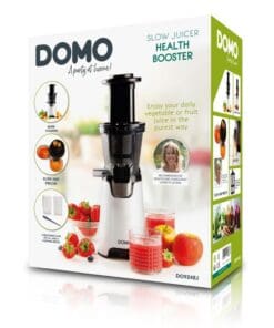 Enjoy a healthy lifestyle with the DOMO Slow Juicer DO9248J. The slow press system ensures the taste, vitamins and nutrients of your fruit and vegetables are preserved perfectly. Perfect for your daily juice, as an energy boost, after a workout, during a detox, etc. The precise extraction technology delivers finer and more pulp-free juice when compared to a classic juicer. This “Health Booster” has a quiet, powerful 150 watt motor. The device can be completely disassembled for easy cleaning with the included brush. The juice outlet is fitted with a shut-off valve to prevent leaks.