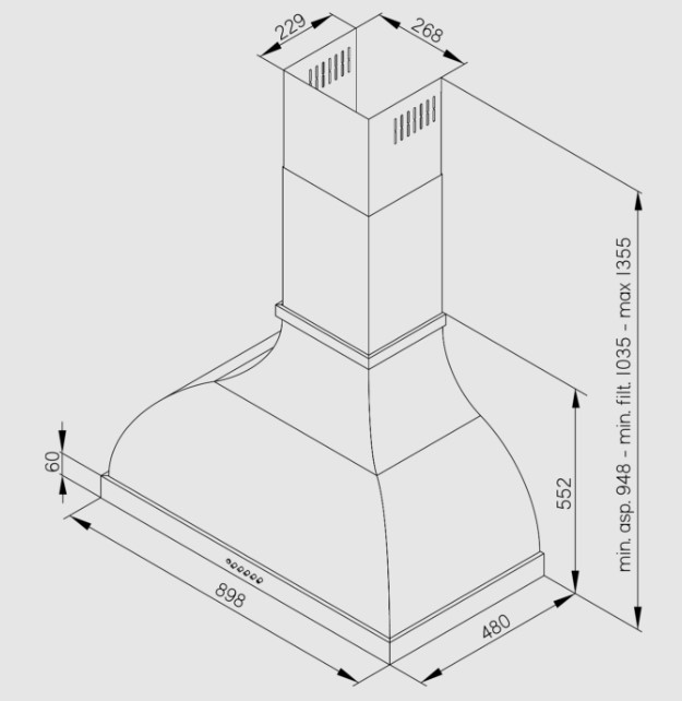 Air-Flow: 578 (m³/h)Noise Level: 45 – 63 dB(A)Lighting: LED 2 x 2,1WControls: Pulsantiera 3VInstallation Type: Wall-mountedDimensions: (WxHxD) 898 x 948 x 480 mmWarranty: Parts 2 years & Labour 2 years
