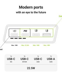 Power: 22.5WBattery: 20,000mAhUsage Time: +45 hoursUSB Outputs: x2 USB-C, x1 USB-AUSB Inputs: x1 USB-CWarranty: Parts 2 years & Labour 2 years