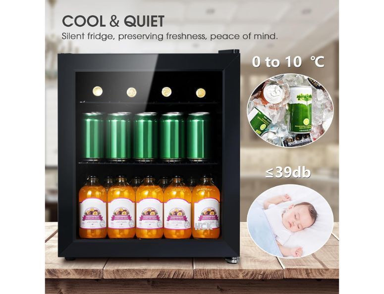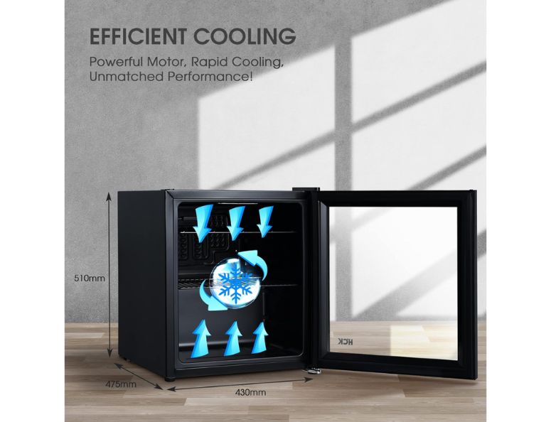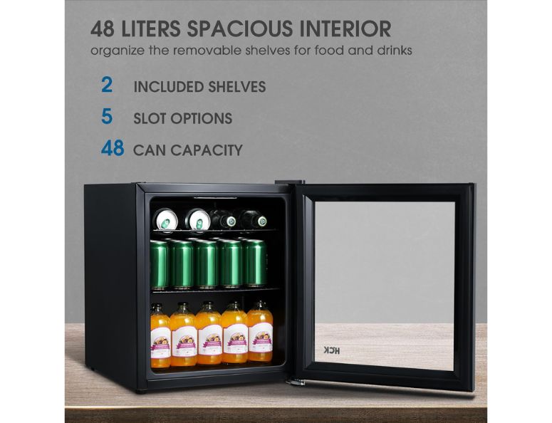 Brand: HCKFridge Capacity: 45 litersNumber of Shelves in Fridge: 2Energy Label: FColour: BlackFeatures: Anti-Vibration System, UV Free LightBottle Capacity: 14 BottlesConsumption: 98kWh/YearNoise Level: 39 dBDimensions: Height 51cm, Depth 48cm, Width 43cmInstallation Type: Free-StandingRefrigeration Type: Wine CoolersWarranty: Parts 2 years & Labour 2 years