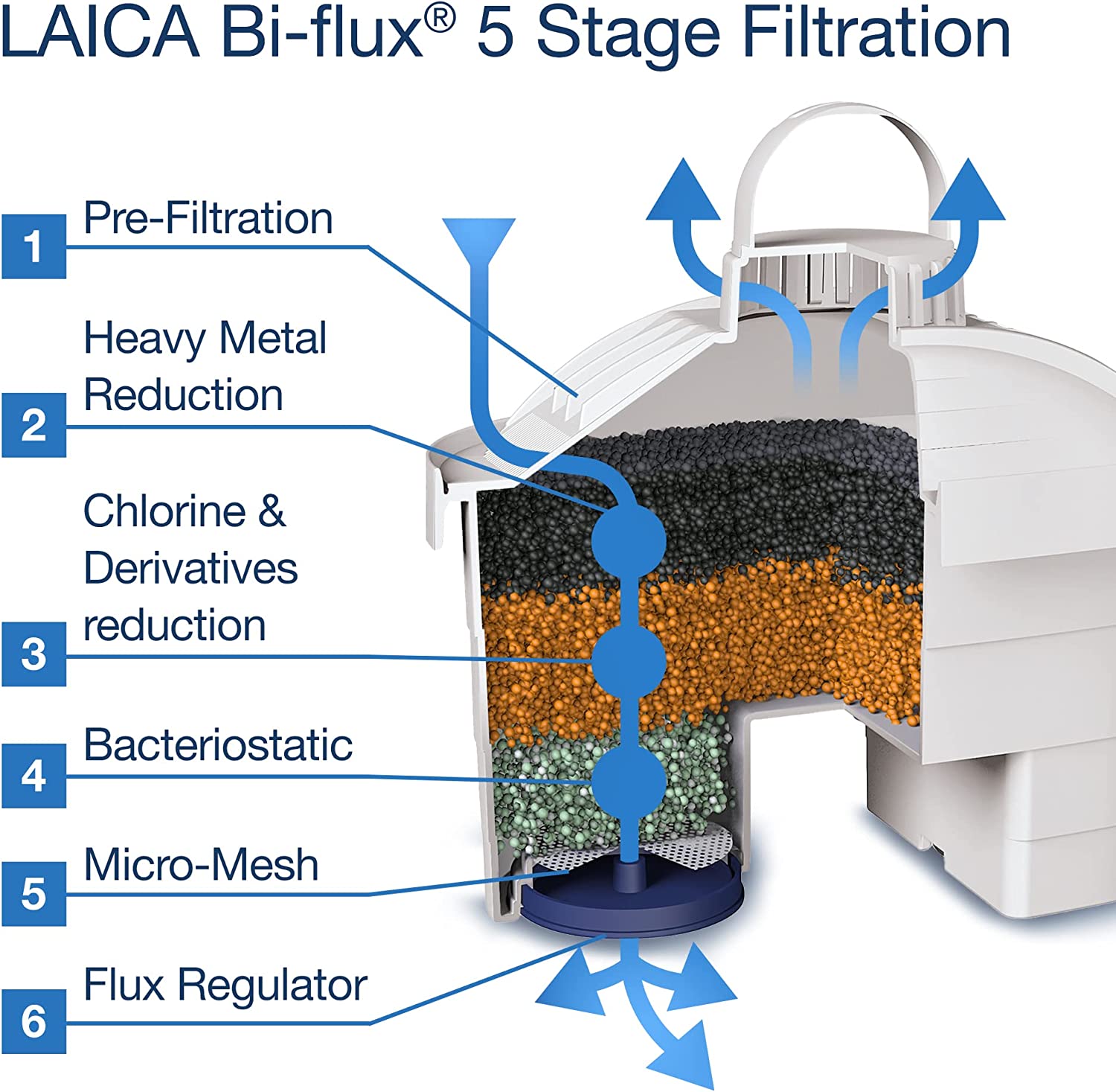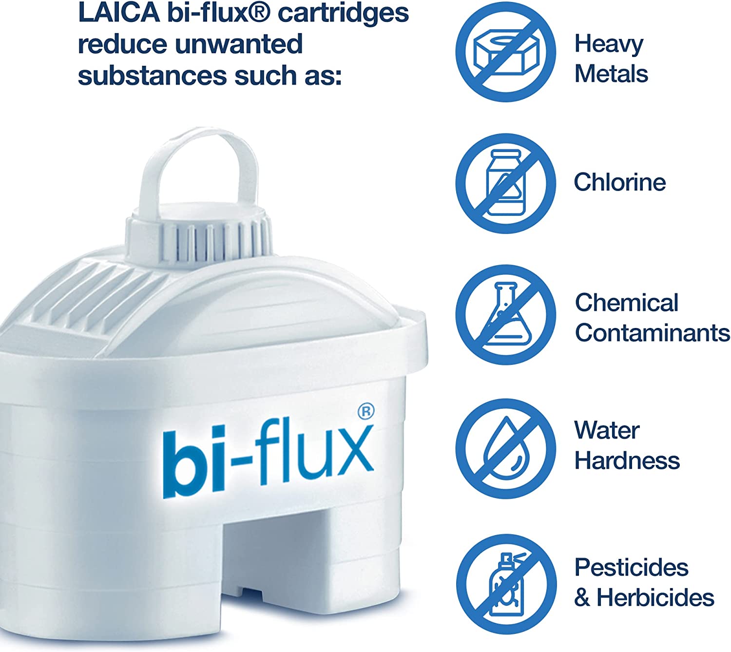 LAICA Bi-Flux Water Filter Cartridges preserve the mineral salts useful to the body naturally present in tap water and reduce water hardness.