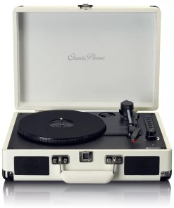 Its suitcase design makes it convenient to carry and use. Simply open the retro case, and you can immediately enjoy your favorite vinyl music through the built-in speakers. This all-in-one turntable eliminates the need for separate speakers. Additionally, the sturdy case with a handle provides excellent protection for your turntable.