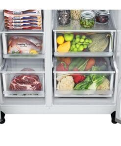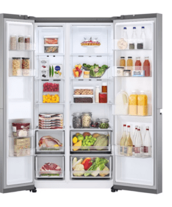 Brand: LGFridge Capacity: 416 litersNumber of Shelves in Fridge: Tempered glass shelves 4Number of Drawers in Fridge: 2., Fresh Zone drawer, Fruit and Vegetable DrawerNumber of door compartments in fridge: Door balconiesFreezer Capacity: 239 litersNumber of Shelves in Freezer: 4Number of Drawers in Freezer: 2Cooling system: No Frost SystemEnergy Label: EConsumption: 352kWh/AnnumColour: InoxNoise Level: 36dB, Class CRefrigeration Type: American StyleInstallation Type: Free-StandingDimensions: Depth 74cm, Height 179cm, Width 91cmWarranty: Inverter Compressor – 10 Years, Parts 2 years & Labour 2 years