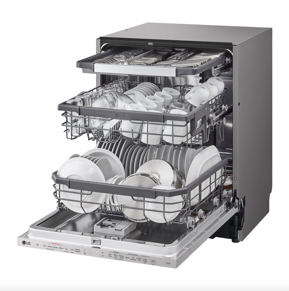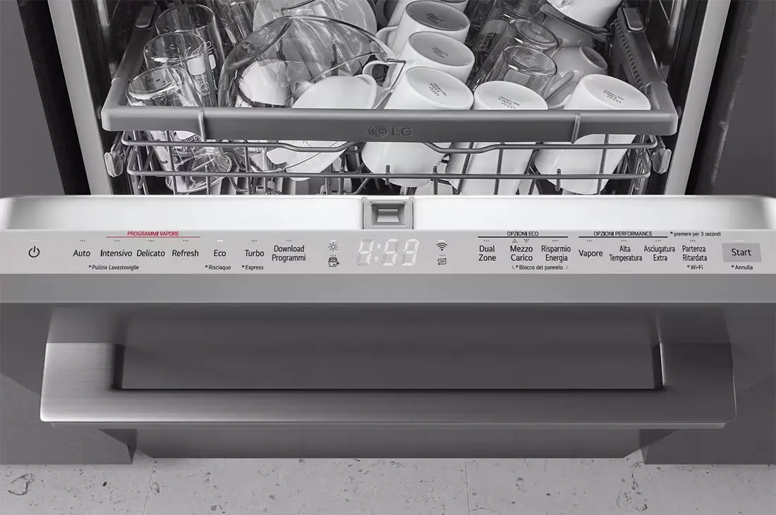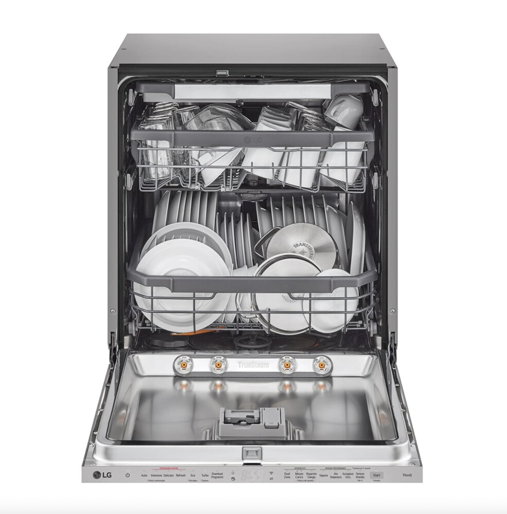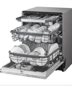 The LG dishwasher is equipped with a genuine steam generator, ensuring top-tier cleaning outcomes. Steam is introduced into the dishwasher’s interior during wash cycles via multiple jets, including four on the door, amplifying its cleaning efficiency.