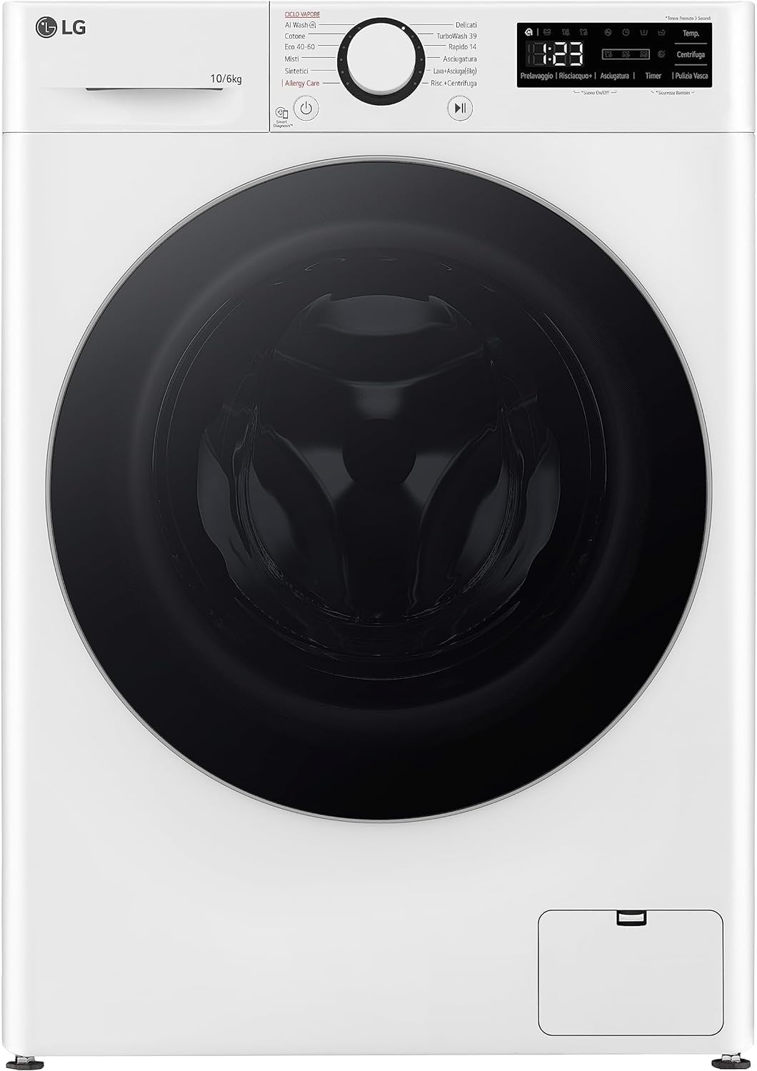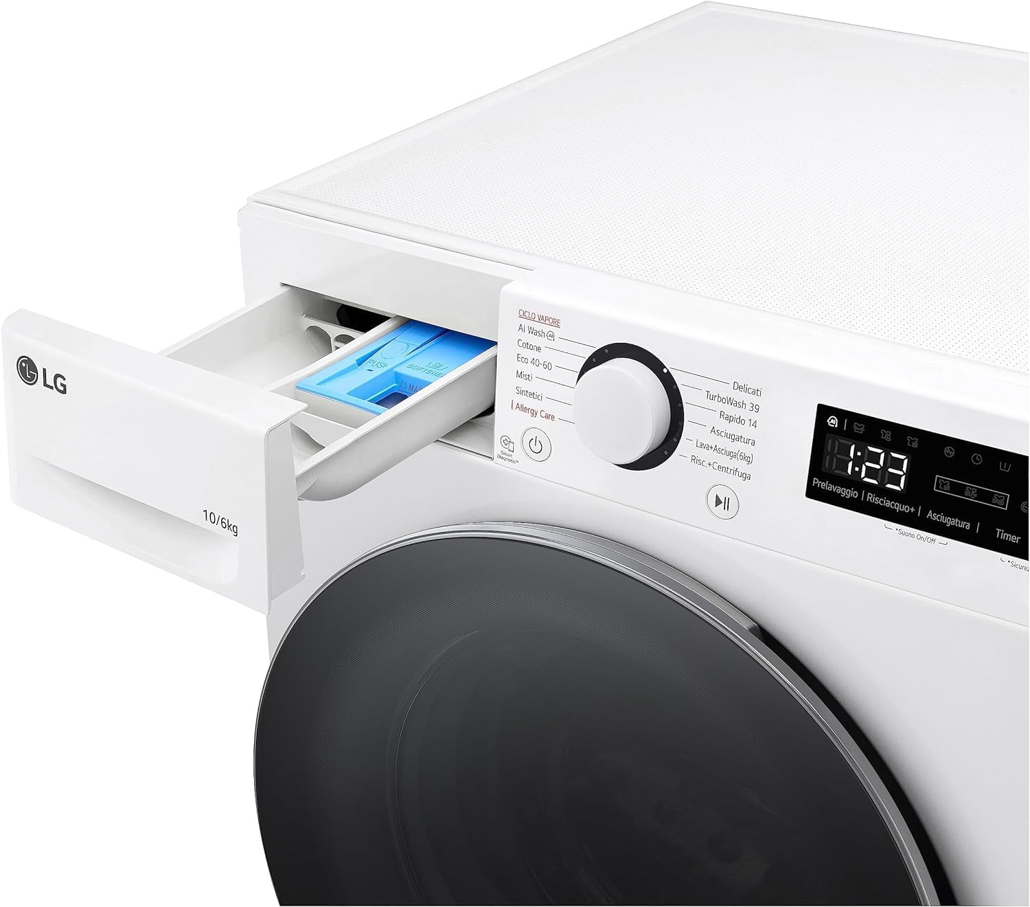 Brand: LGLoad capacity: 10kg + 6kgSpin Speed (RPM): 1400RPMDisplay: LEDNoise Level: 71dBFeatures: AI DD, Motor Direct Drive Inverter, Steam washing, TurboWashNumber Of Programs: Allergy Care, Cotton, Delicate, Eco 40-60, Mixed, Rapid, Synthetics, Wash + Dry, Rinse + spin, Tub cleaning, TurboWash 39′Energy Label: DEnergy Consumption: 308 kWh/100 CyclesInstallation Type: Free-StandingDimensions: (WxHxD) 600 x 850 x 565mm