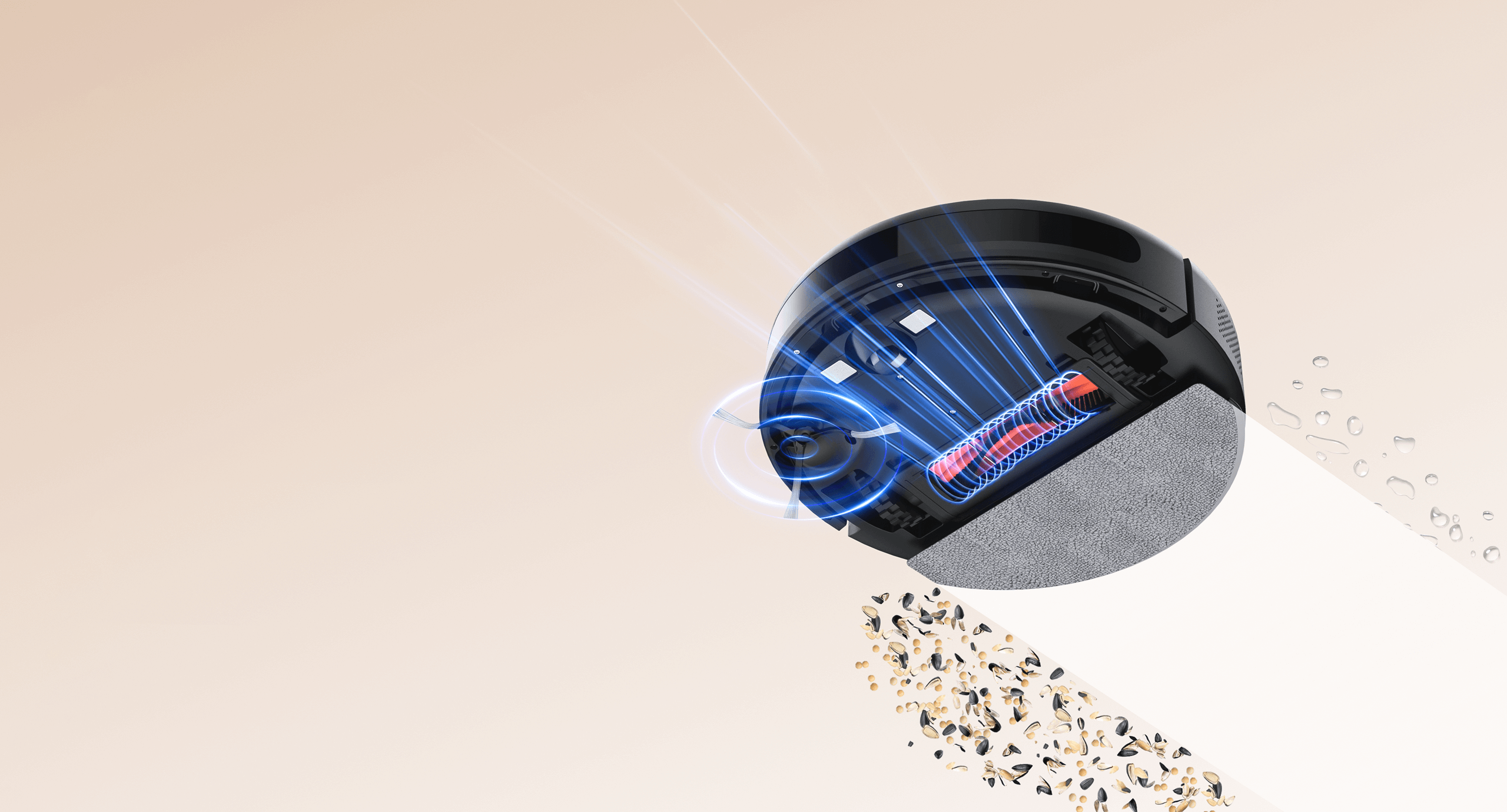 High-quality integrated parts, including side brush, main brush, and dust box filter, with multi-directional coordination for a complete and efficient cleaning experience.