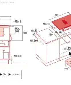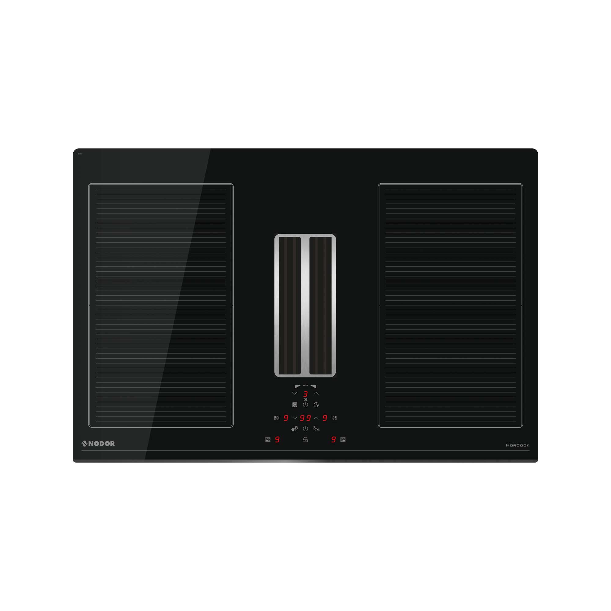 Brand: NodorProduct Type: Built-In Induction Hob + ExtractorCooking Power: 7.2 kWPower Levels: 9 power levels + BoosterExtraction / Ventilation: Max Extraction : 545 m³/h. Min Extraction : 198 m³/h.Number of cooking zones: 4, Two of the zones are “modular” / combinable: each of the two main areas is 21×19 cm, can combine into 21×38 cm.Motor Type: Brushless (extra silent) with certain pressure/turbo specs.Noise Level: 45 dB(A) in normal mode, 64 dB(A) in other modesEnergy Label: AFeatures: Child lock, Residual heat indicator, Touch Control PanelDimensions: 770mm W , 52mm DWarranty: Parts 5 years & Labour 5 years