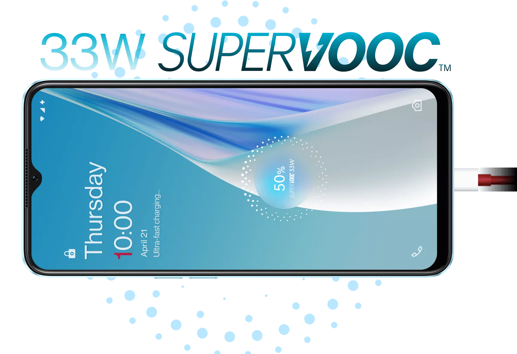 You’ll never experience delays due to a low battery, thanks to the 33W SUPERVOOC™ fast charging, which enhances your battery capacity by 50% in only 34 minutes.