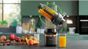 New Philips Flip & Juice Blender is our first high speed blender with juicing module. Thanks to revolutionary jar design and integrated filter, you get your drink with a texture adjusted to your family’s preferences. From perfectly silky smoothies to clear or pulpy juices, our most advanced blender offers the widest variety. It combines blending and juicing in one solution, saves space in your kitchen.
