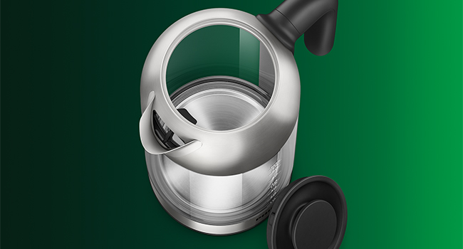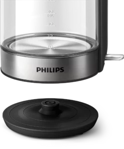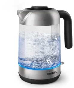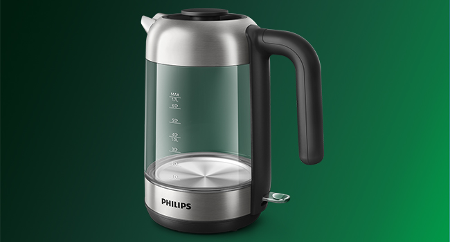 Philips family-size 1.7L glass kettle features a modern design with an intuitive blue light indicator inside the base to inform you when the kettle is on.