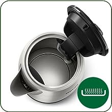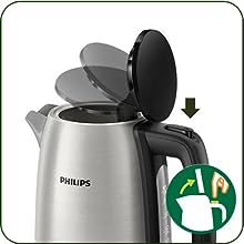 The stylish HD9350/96 stainless steel kettle comes with a flat heating element, guaranteeing rapid boiling while also being effortless to clean. Its spring-loaded lid opening makes it easily accessible.