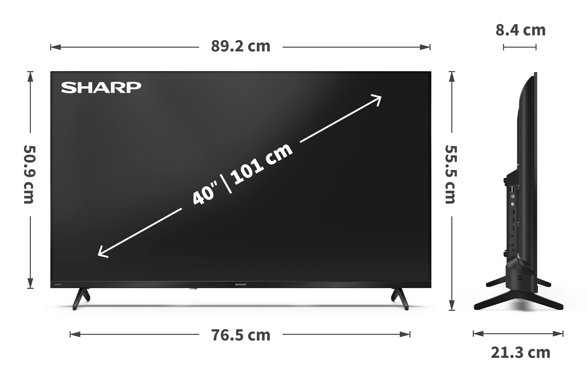 Brand: SharpDisplay / Backlight Technology: LED backlightResolution: Full HD (1920×1080)Refresh Rate: 60HzOperating System: Google TV™Wi-Fi Connectivity: Yes (Integrated)Bluetooth Connectivity: YesEnergy Label: EHDMI Ports: x3USB Ports: x2Speaker Power: 2 x 8WVESA: 200 x 200 mmDimensions With Stand: 892 x 509 x 84 (W x H x D mm)Warranty: Parts 2 years & Labour 2 years