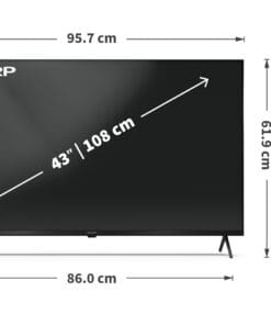 Brand: SharpScreen Size: 43″Technology: QLED DisplayResolution: 4K / UHDOperating System: Google TVWi-Fi Connectivity: Yes (Integrated)Bluetooth Connectivity: YesHDMI Ports: x4 HDMI 2.1 InputsUSB Ports: x2DVB-T/T2/C/S/S2 Tuner: YesVESA: 300 x 300 mmEnergy Label: GDimensions With Stand: (WxHxD) 957 x 619 x 230 mmWarranty: Parts 2 years & Labour 2 years