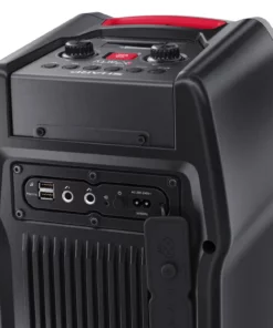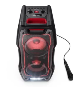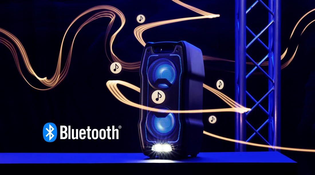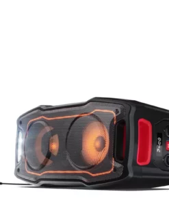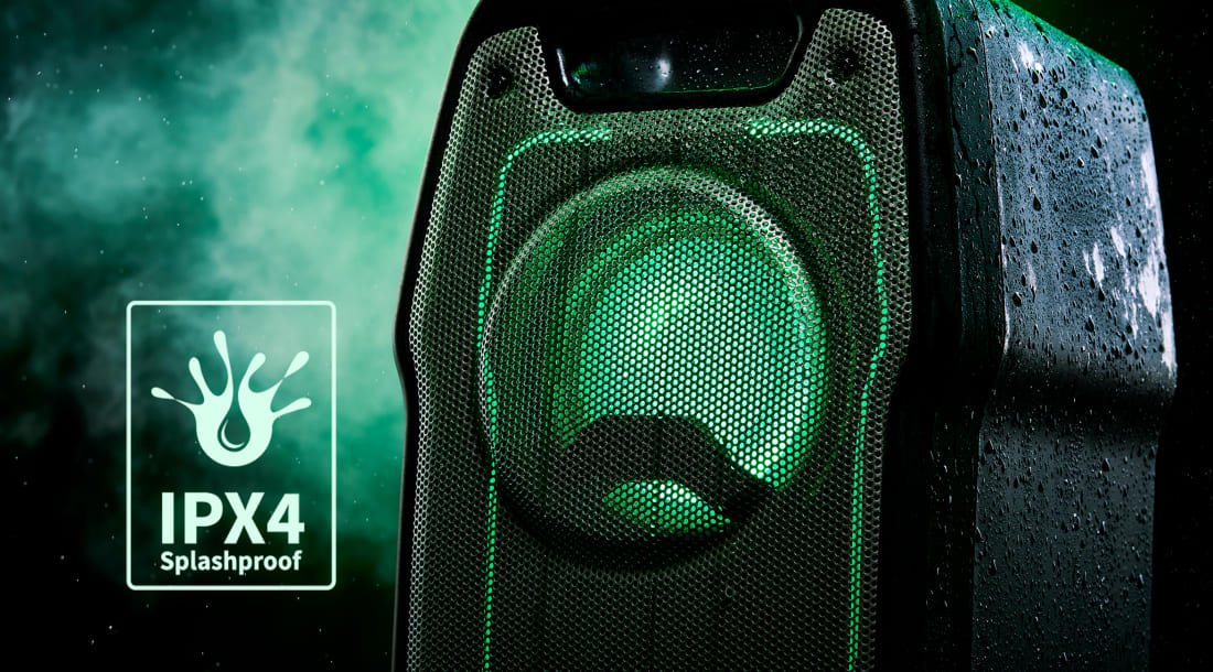 A splashproof, portable Bluetooth® party speaker with disco lights, a strobe, and a microphone!