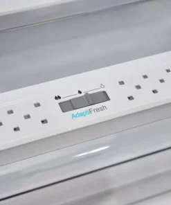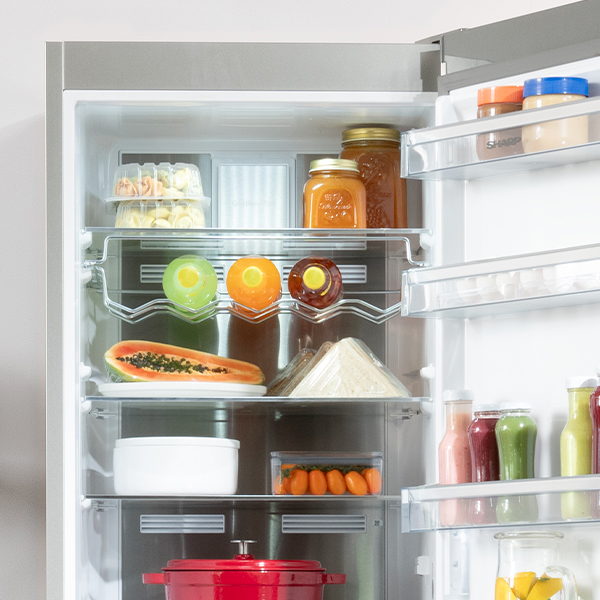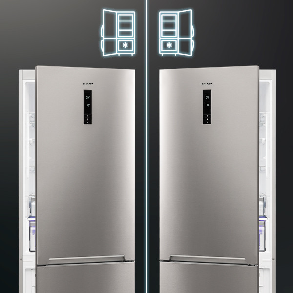 The SHARP  Fridge-Freezer offers Frost Free Cooling Technology to prevent ice build-up, AdaptiLift for adjustable storage, a Chrome Wine Rack for convenient bottle organization, a Reversible Door for flexible installation, and an Odor Free system to keep your fridge fresh.