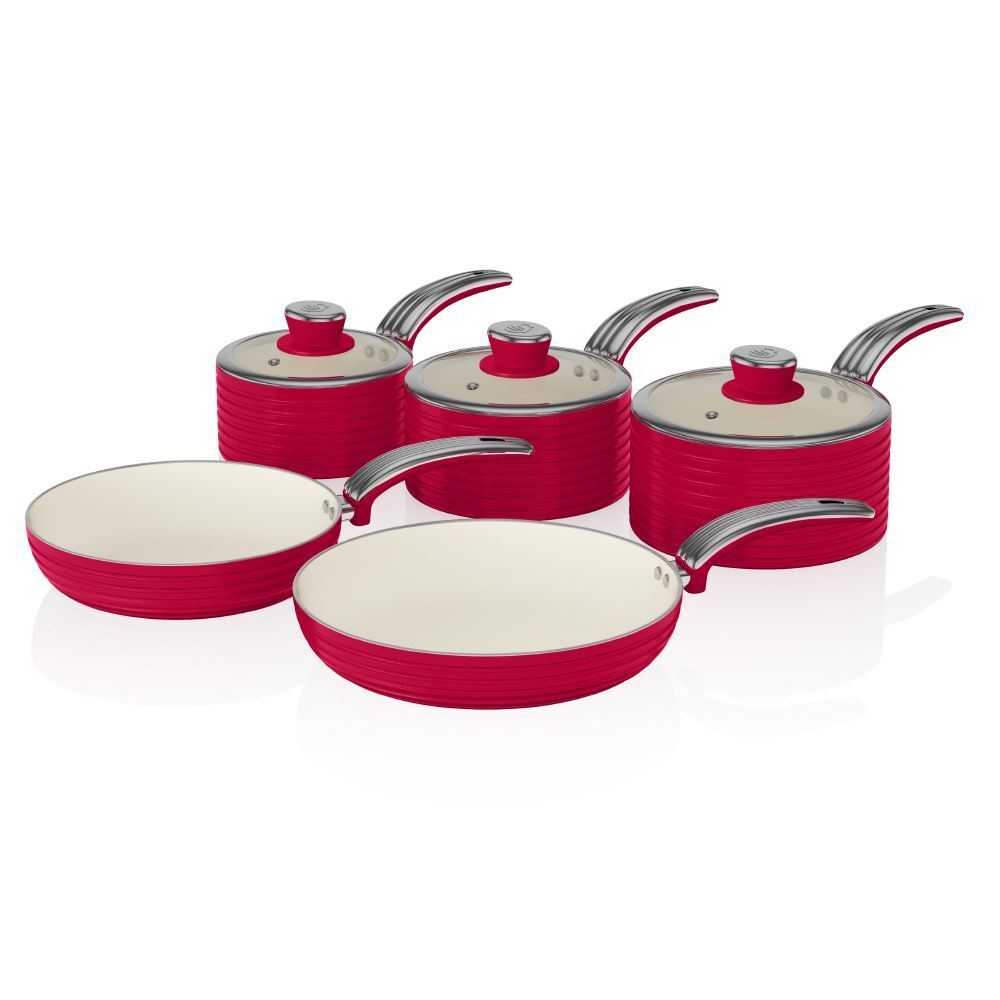 Brand: SwanSize: 16cm, 18cm and 20cm (Sauce Pans) 20cm and 28cm (Frying Pans)Material: Stainless SteelColour: Red